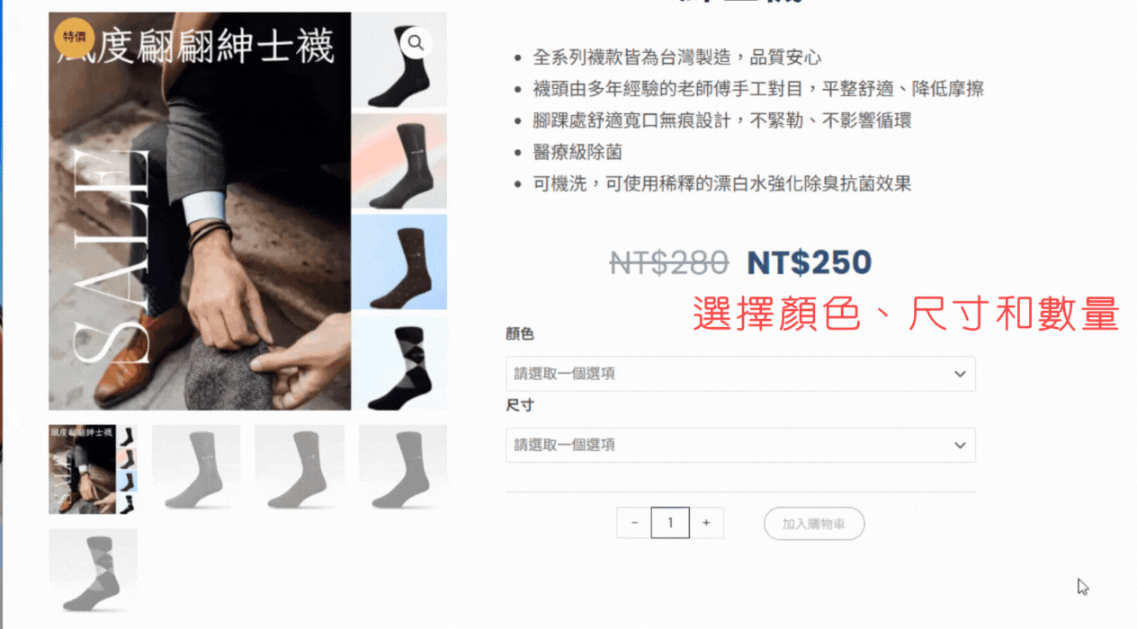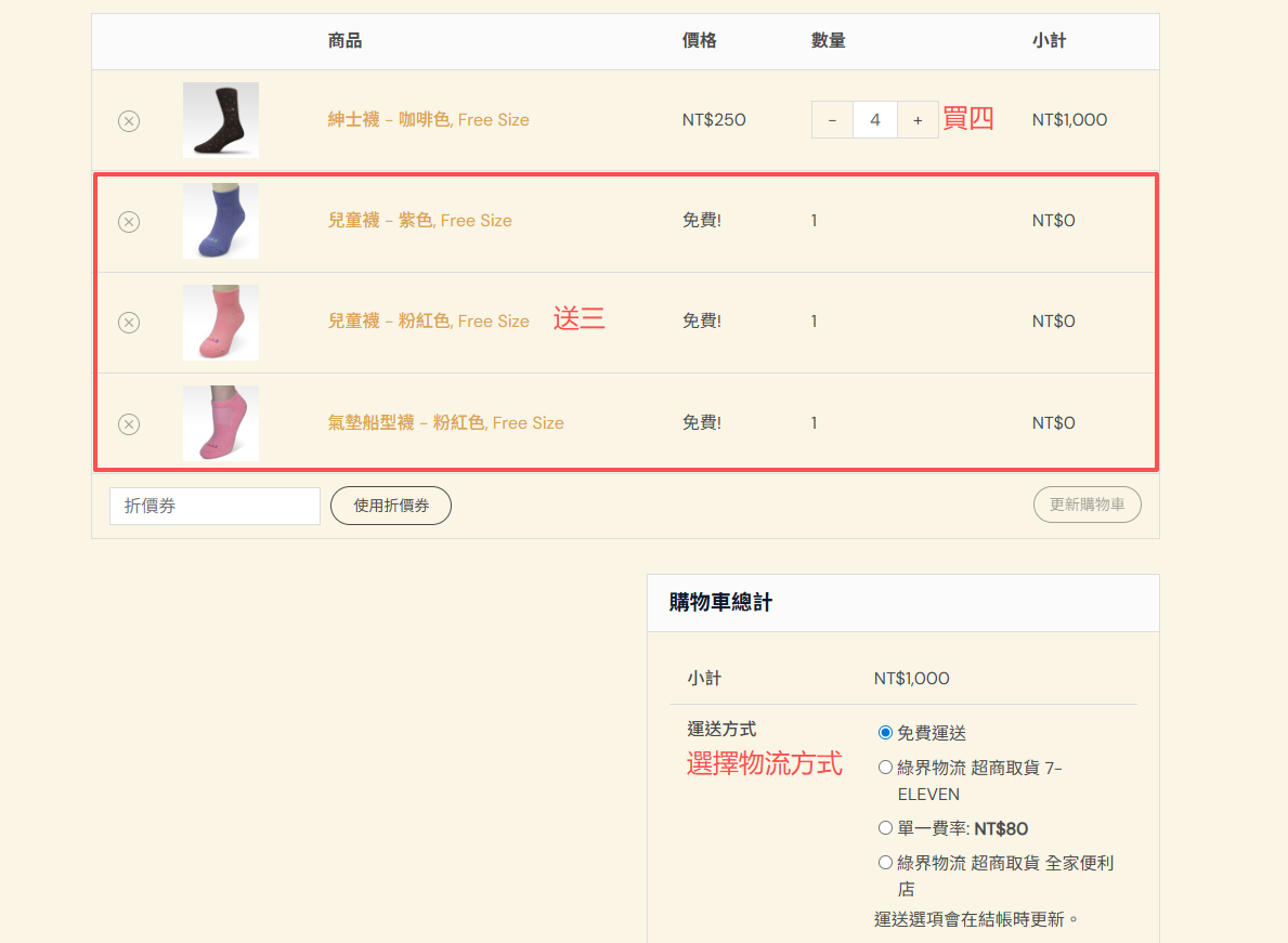 第五步:購物車會出現購買的襪款(四件)+贈品(三件)