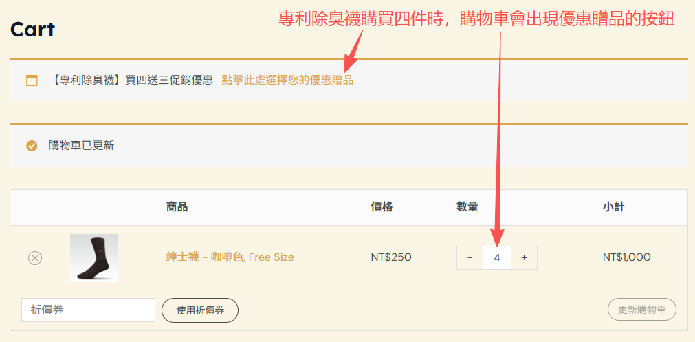第三步:購物車會出現買四送三的贈品按鈕